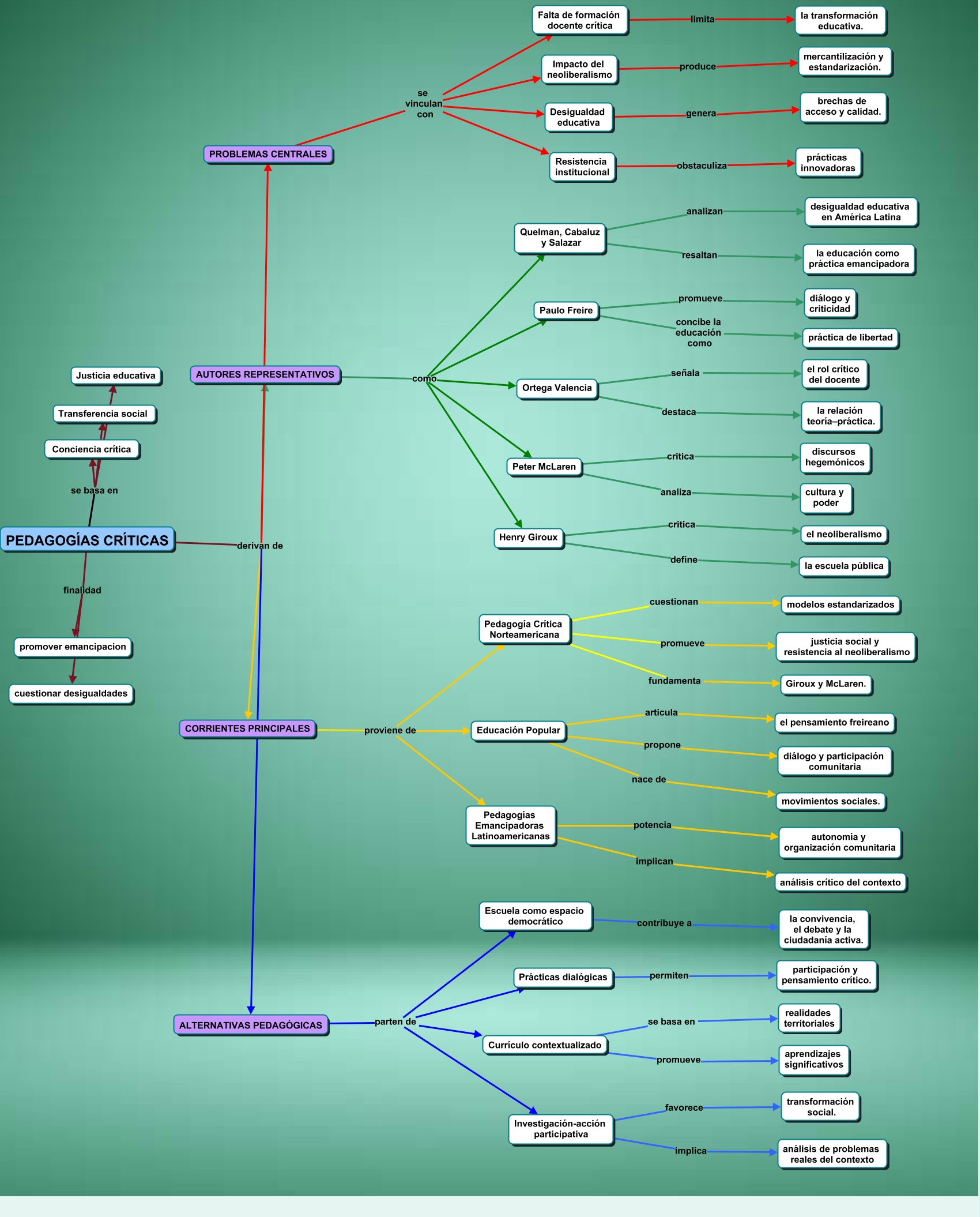 Este Cmap, tiene información relacionada con: pedagogias criticas, PROBLEMAS CENTRALES se vinculan con Desigualdad educativa, Educación Popular articula el pensamiento freireano, Investigación-acción participativa favorece transformación social., PEDAGOGÃ?AS CRÃ?TICAS derivan de CORRIENTES PRINCIPALES, Ortega Valencia señala el rol crÃtico del docente, PedagogÃas Emancipadoras Latinoamericanas potencia autonomÃa y organización comunitaria, PEDAGOGÃ?AS CRÃ?TICAS finalidad promover emancipacion, CurrÃculo contextualizado se basa en realidades territoriales, AUTORES REPRESENTATIVOS como Ortega Valencia, AUTORES REPRESENTATIVOS como Peter McLaren, CORRIENTES PRINCIPALES proviene de Educación Popular, AUTORES REPRESENTATIVOS como Quelman, Cabaluz y Salazar, CurrÃculo contextualizado promueve aprendizajes significativos, Escuela como espacio democrático contribuye a la convivencia, el debate y la ciudadanÃa activa., PEDAGOGÃ?AS CRÃ?TICAS finalidad cuestionar desigualdades, Peter McLaren analiza cultura y poder, ALTERNATIVAS PEDAGÓGICAS parten de Investigación-acción participativa, PEDAGOGÃ?AS CRÃ?TICAS derivan de PROBLEMAS CENTRALES, Prácticas dialógicas permiten participación y pensamiento crÃtico., Ortega Valencia destaca la relación teorÃa–práctica.
